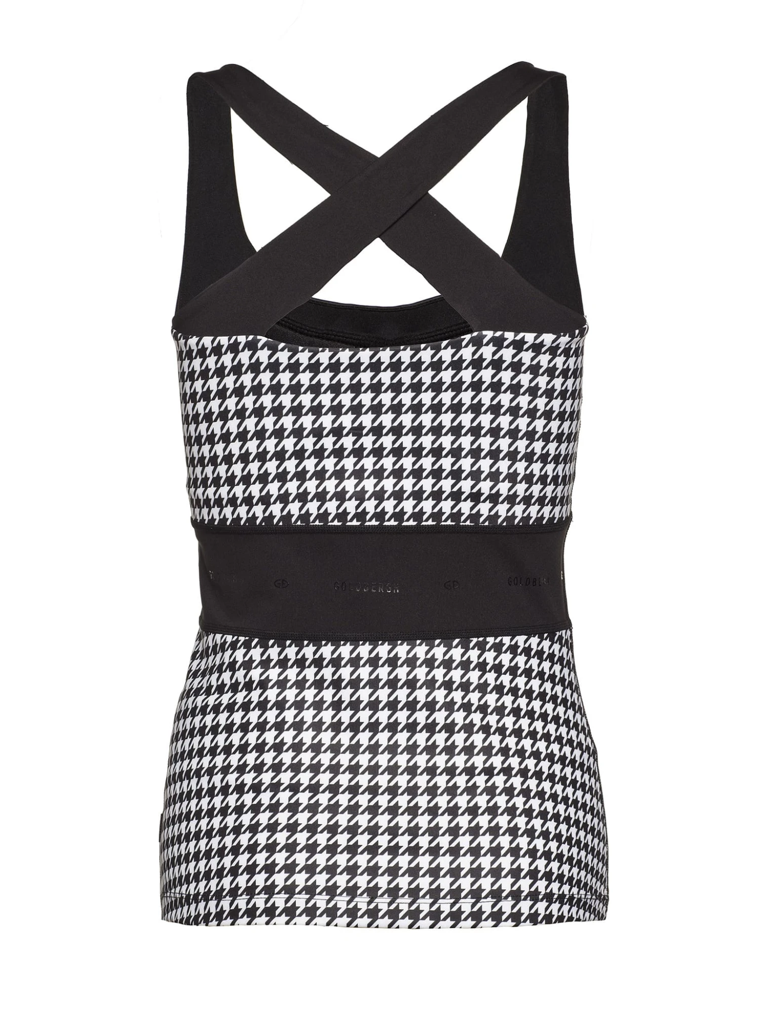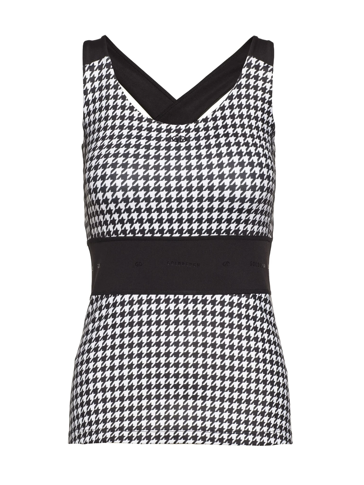 De Goldbergh Peggy Sleeveless Top 2022 is een prachtige sporttop in pied-de-poule dessin met bh-inzet. De horizontale banden aan de achterkant zijn horizontaal gekruist en het zwarte tussenstuk benadrukt het vrouwelijke silhouet. De Goldbergh Peggy Sleeveless Top 2022 is mouwloos en heeft een mooie ronde hals. Het zachte, elastische materiaal is ademend, sneldrogend en anti-geur. Deze top heeft een opvallende print en is mooi te combineren met de Goldbergh skirts, shorts en leggings uit de collectie. Hoe mix jij het? Sportief yet superstylish!